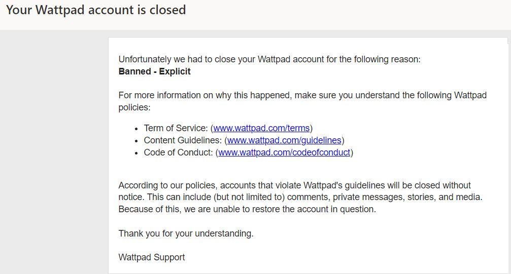 Anyway, this post is just to alert you why my Wattpad links no longer work. I’m terribly sorry for the inconvenience. I was given no warning or information before this happened. And by doing this, Wattpad effectively prevents all of my readers from finishing the stories I had over there. Not to forget all the comments and messages I had received. All is lost.